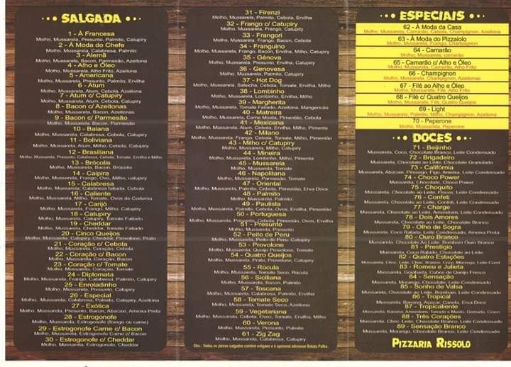 Pizzaria Rissolo Delivery, located in Braço do Norte, Brazil, stands out for its remarkable variety of delicious pizzas. Customers rave about the fast delivery and excellent service, making it a go-to option for pizza lovers. With an array of flavors, including both savory and sweet options, each pizza is crafted to satisfy diverse palates. Rissolo's commitment to quality is evident in its fresh ingredients and careful preparation. Many patrons, like Thuany and Magali, have praised the pizzas for their generous cheese and temperature upon arrival. It’s a delightful experience for anyone looking to indulge in flavorful, well-made pizza.